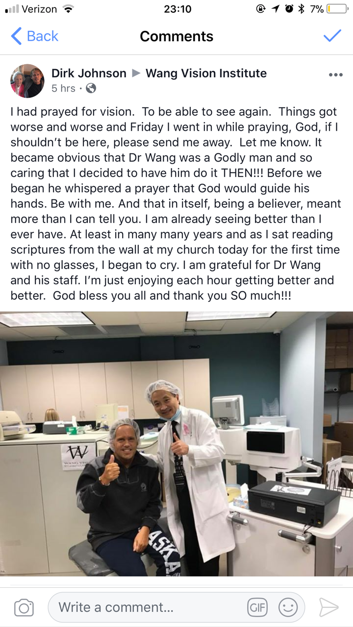 As my daughter and I were talking with your front desk receptionists a voice was heard to cry out in your surgical room. We all looked at each other and wondered what that was all about. Was someone in severe pain? I looked at my daughter to see her reaction to the scream. She looked frightened as she was already apprehensive about having the Lasik surgery. Suddenly your office door opened and this lady came bursting, screaming with joy, into the reception area looking for her loved ones to tell them the news that her prayers had been answered, that God had restored her sight. She was beside herself!!! Again I looked at my daughter and this time she was crying… Tears of joy for this lady who also had the blessing of meeting Dr. Ming Wang and was healed of the affliction of blindness. She claimed it to be a miracle and after thinking about that situation for almost twenty four hours I agree with the lady. It is, you are creating miracles everyday affecting millions of lives in a wonderfully positive lasting way. You have seemingly tried to be your very best in life, in God’s eyes, and your are a blessed man. As my favorite pastor, Allen Jackson, loves to say “ God is Great ALL The Time”, I agree………
