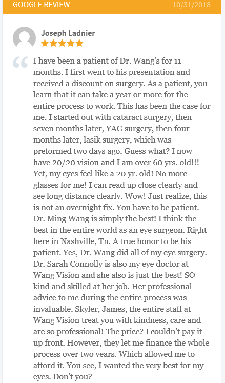 Dr Wang and his entire staff are extremely helpful and caring. You wont find a nicer and more helpful group of people anywhere. If you are thinking of lasik Go see dr wang first and there will be no need to go anywhere else.